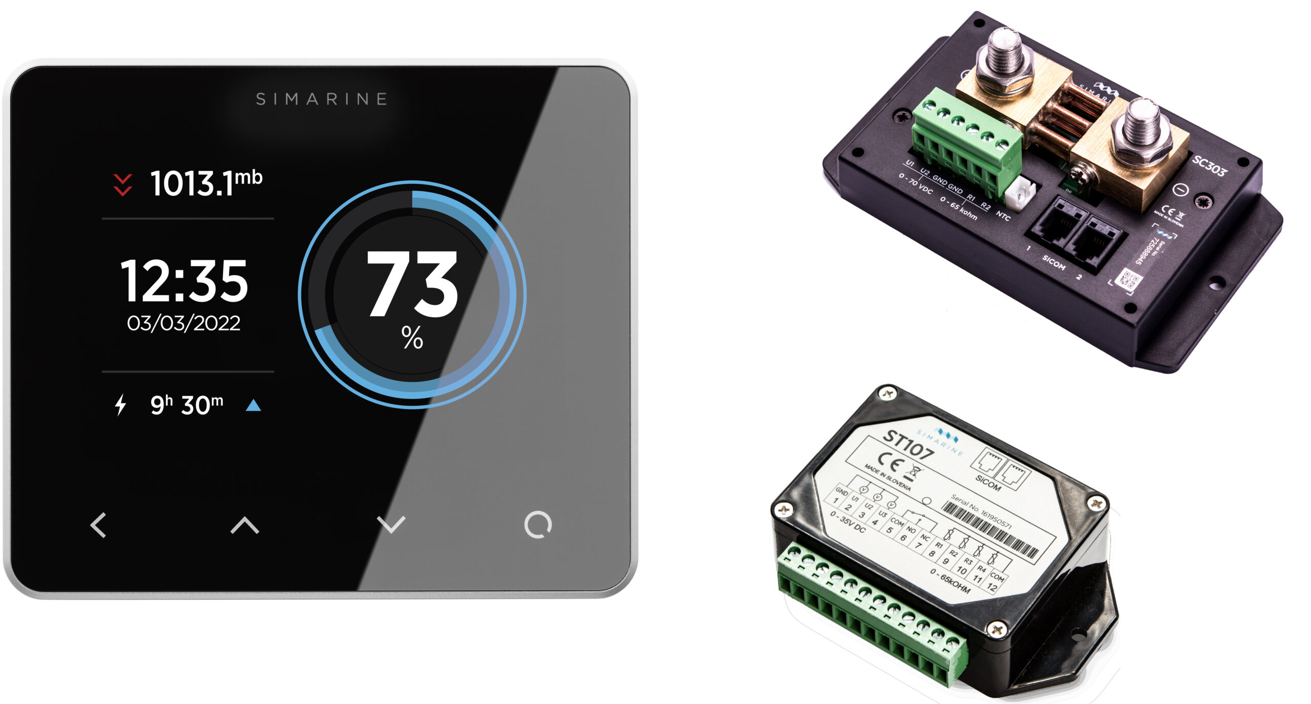 Die Besonderheit des SIMARINE Systems ist die übersichtlich farbliche Darstellung auf dem Display, die sich je nach Zustand farblich verändert und gut ablesbar ist. Somit lässt sich auf einen Blick der Energiezustand erkennen. Mit diesem Paket werden die wichtigsten Daten für 2 Batteriebänke und 2-9 Tanks überwacht. Meist wird der Shunt SC303 an die Verbraucherbatterie angeschlossen. Von der Verbaucherbatterie werden dann die Ströme, Spannung und die Temperatur gemessen.